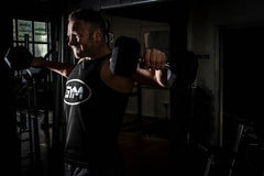 - Start by holding one weight in your hands (or two dumbbells) and pull your elbows upwards until your upper arms are parallel with the floor. Then lower back down.